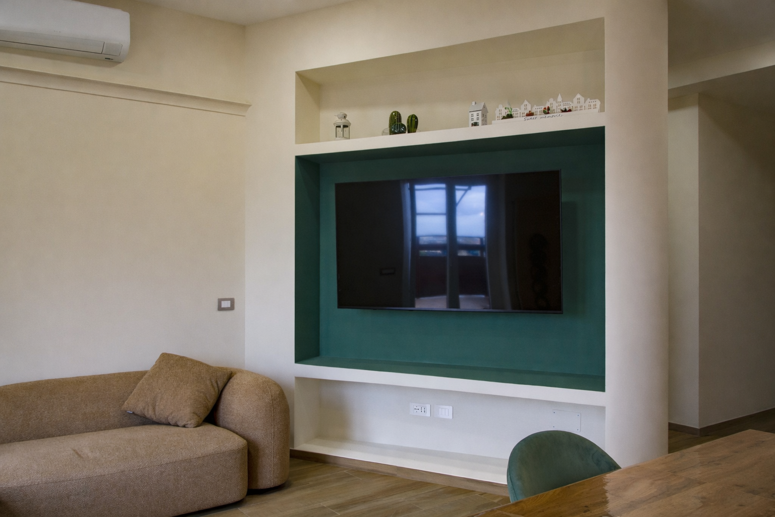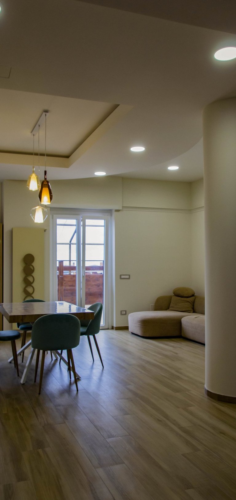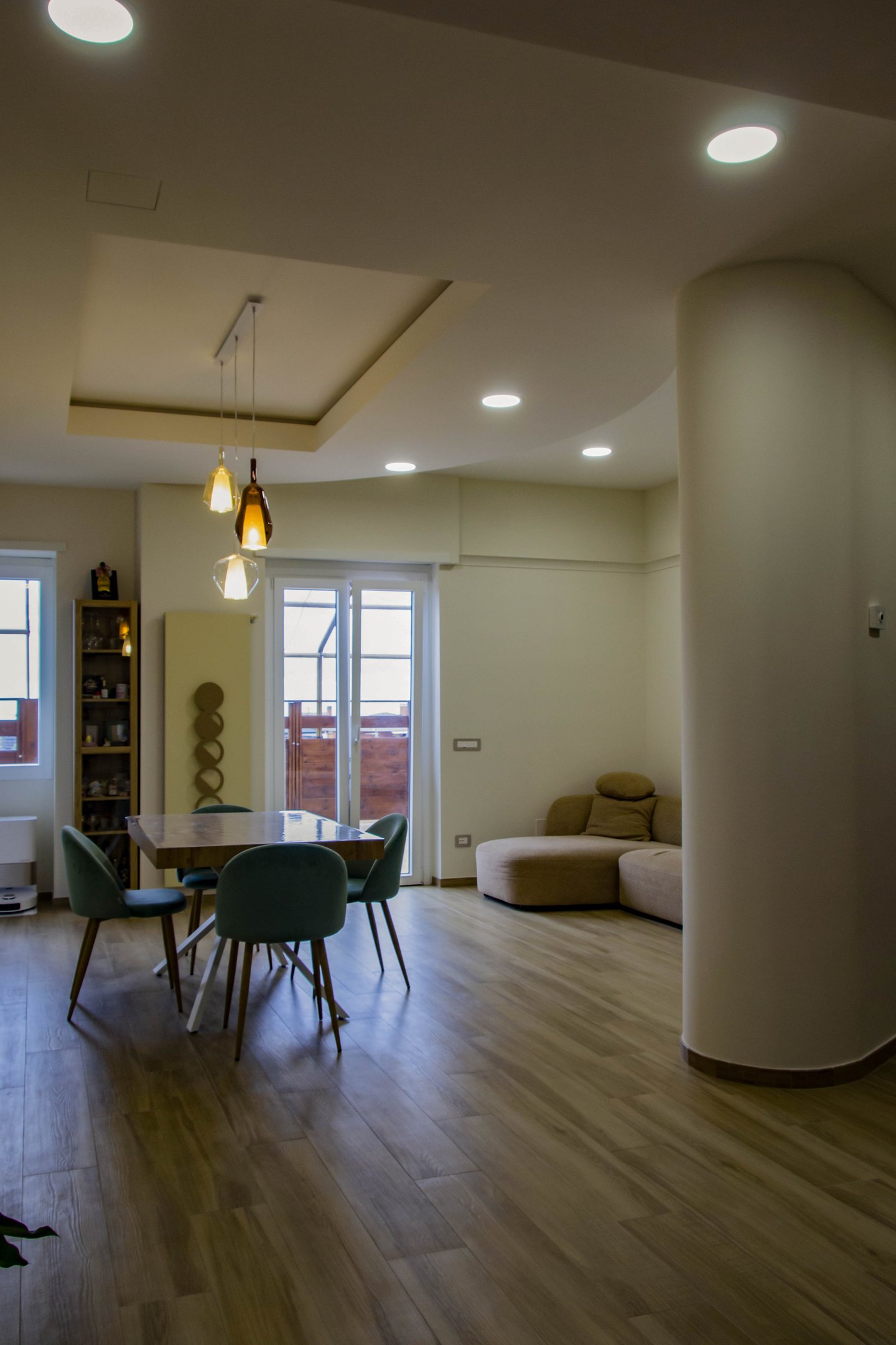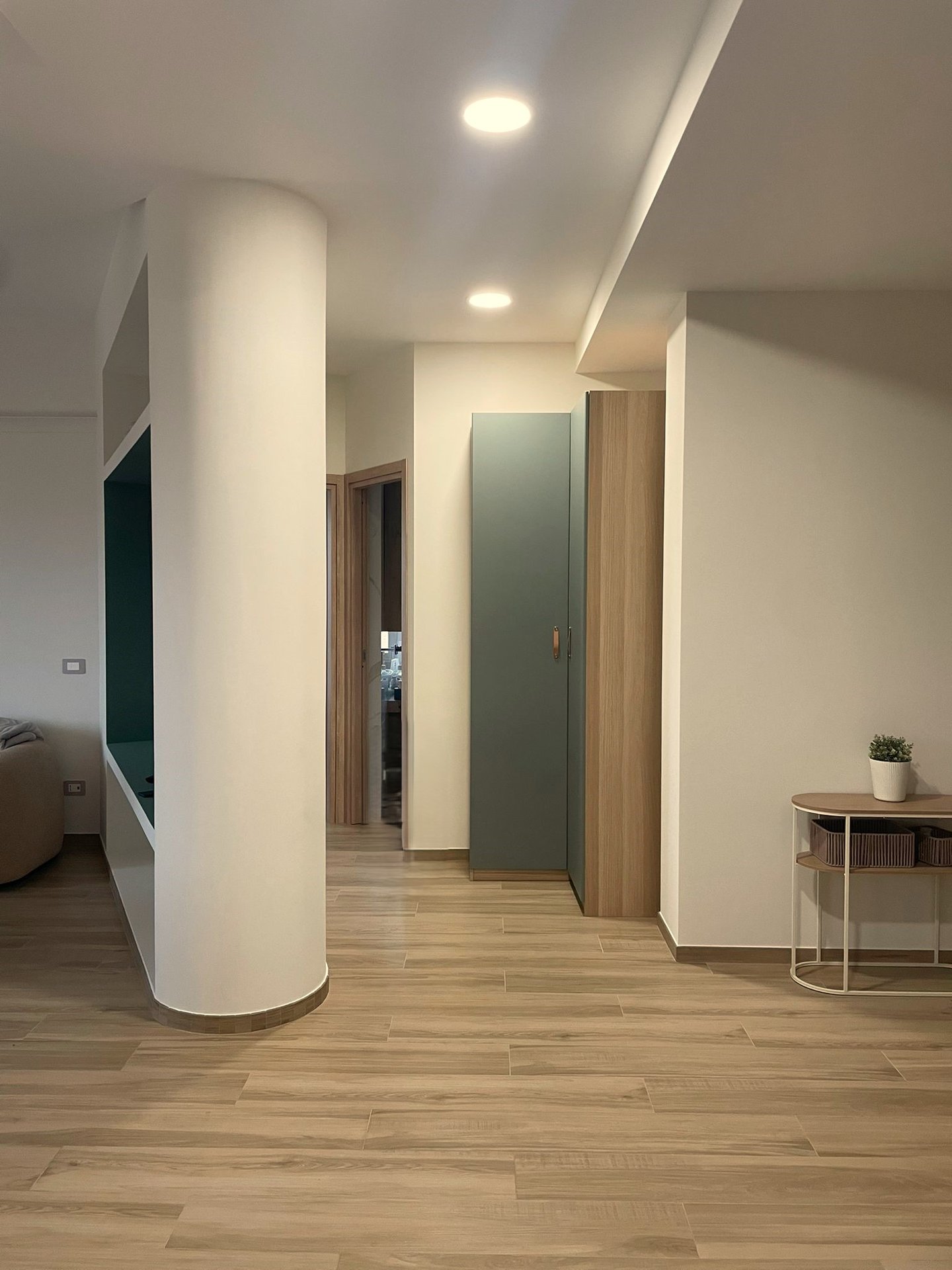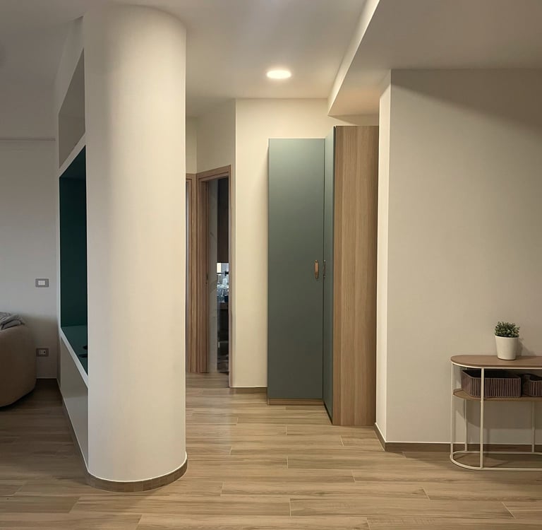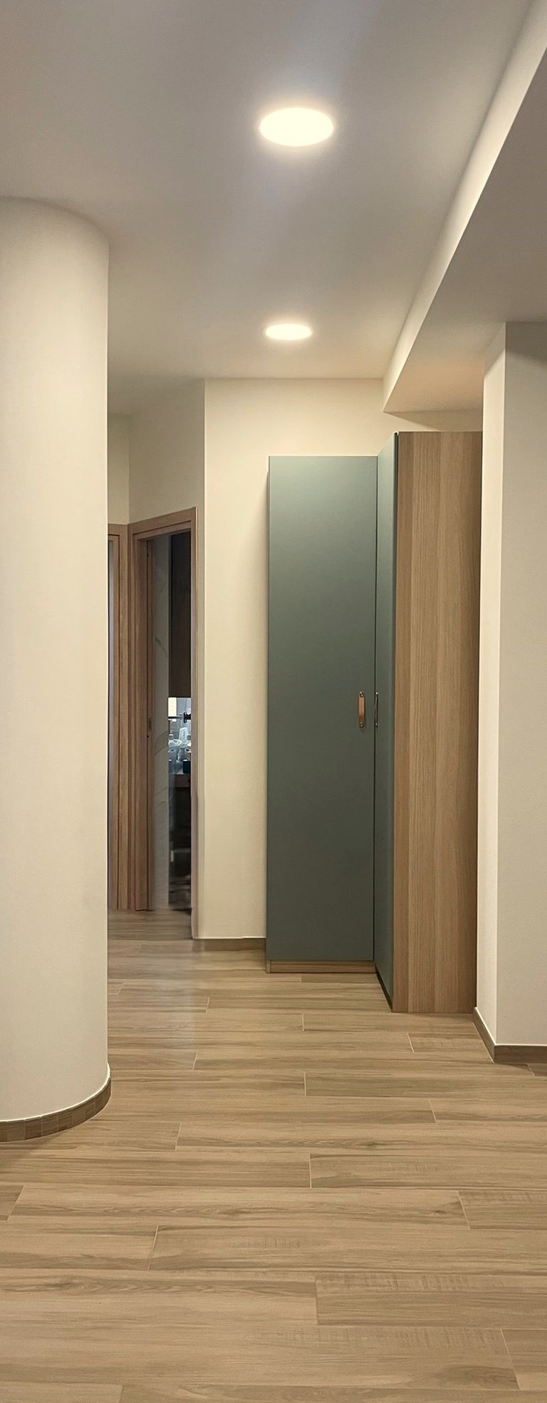 L’intervento ha previsto il rinnovamento integrale degli ambienti con attenzione a funzionalità e continuità estetica: pavimenti effetto legno, omogeneo in tutta l'abitazione per dare un forte senso di continuità , finiture essenziali e arredi su misura. I bagni sono stati ripensati in chiave contemporanea con gres effetto pietra, sanitari sospesi e particolare rubinetteria e arredo per dare seguito alle volontà ed esigenze dei clienti. La scelta dei colori e dei materiali si ripete per tutto l'appartamento per un risultato pulito, luminoso e coerente.