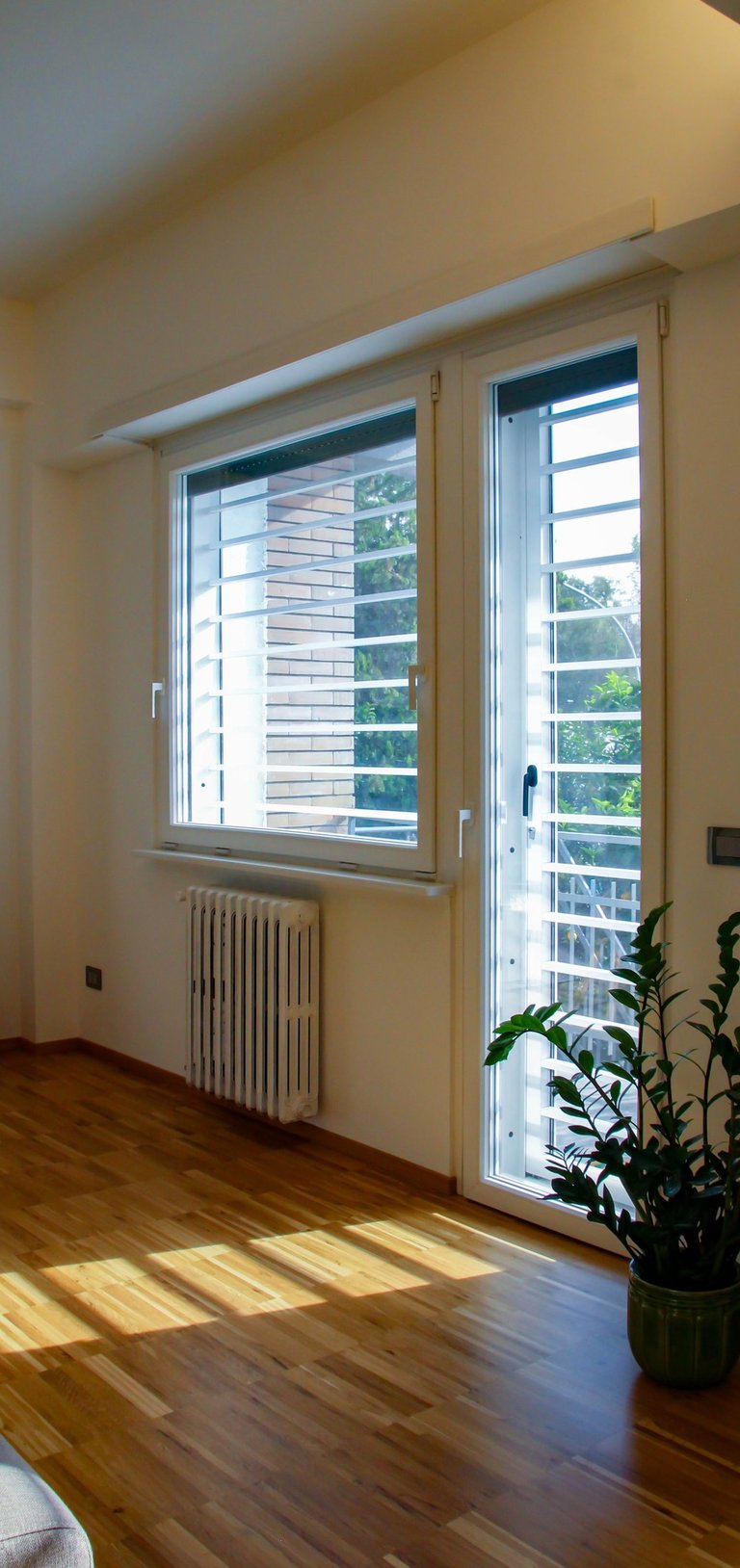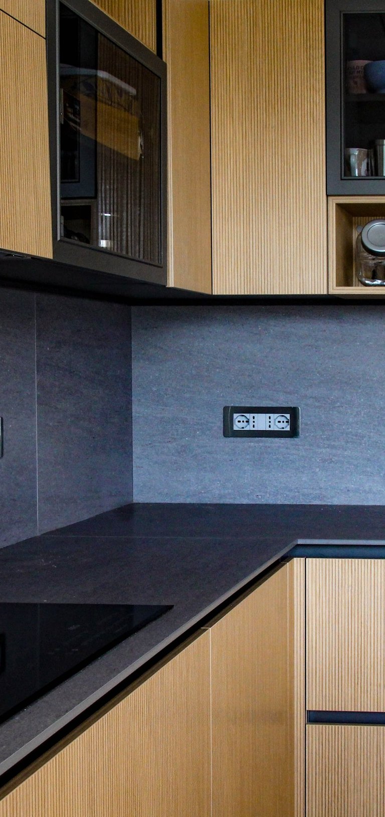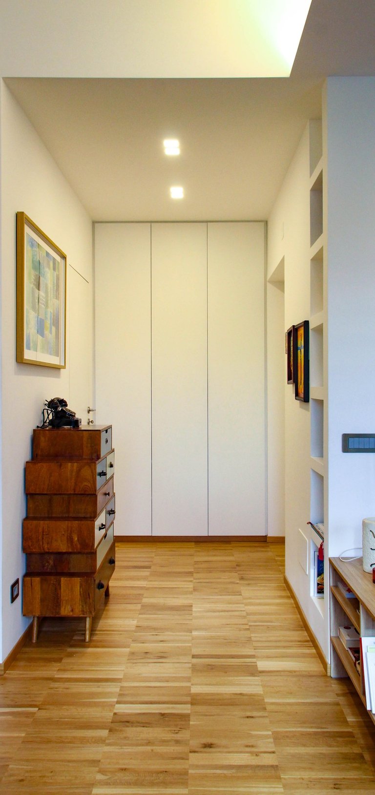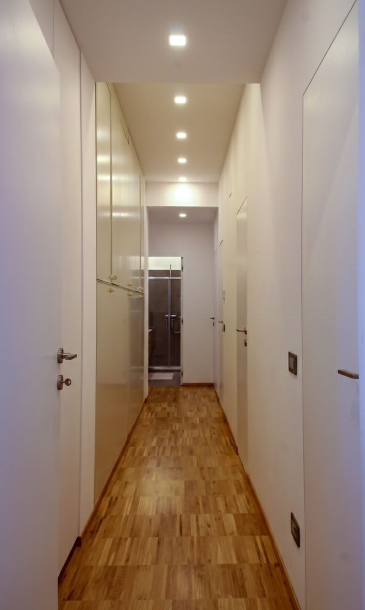 Il parquet, scelto come pavimentazione continua per tutta la casa, diventa l’elemento unificante del progetto: un filo materico che accompagna lo sguardo e dona calore, continuità e armonia agli spazi. La matericità del legno si ripete in modo coerente anche negli arredi su misura, nelle armadiature integrate e nella cucina, generando un linguaggio omogeneo. L’atmosfera che ne deriva è accogliente e raffinata, dove materiali naturali, proporzioni equilibrate e cura del dettaglio definiscono l’abitazione.