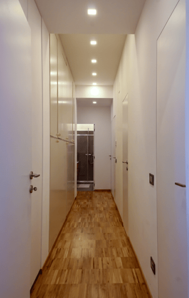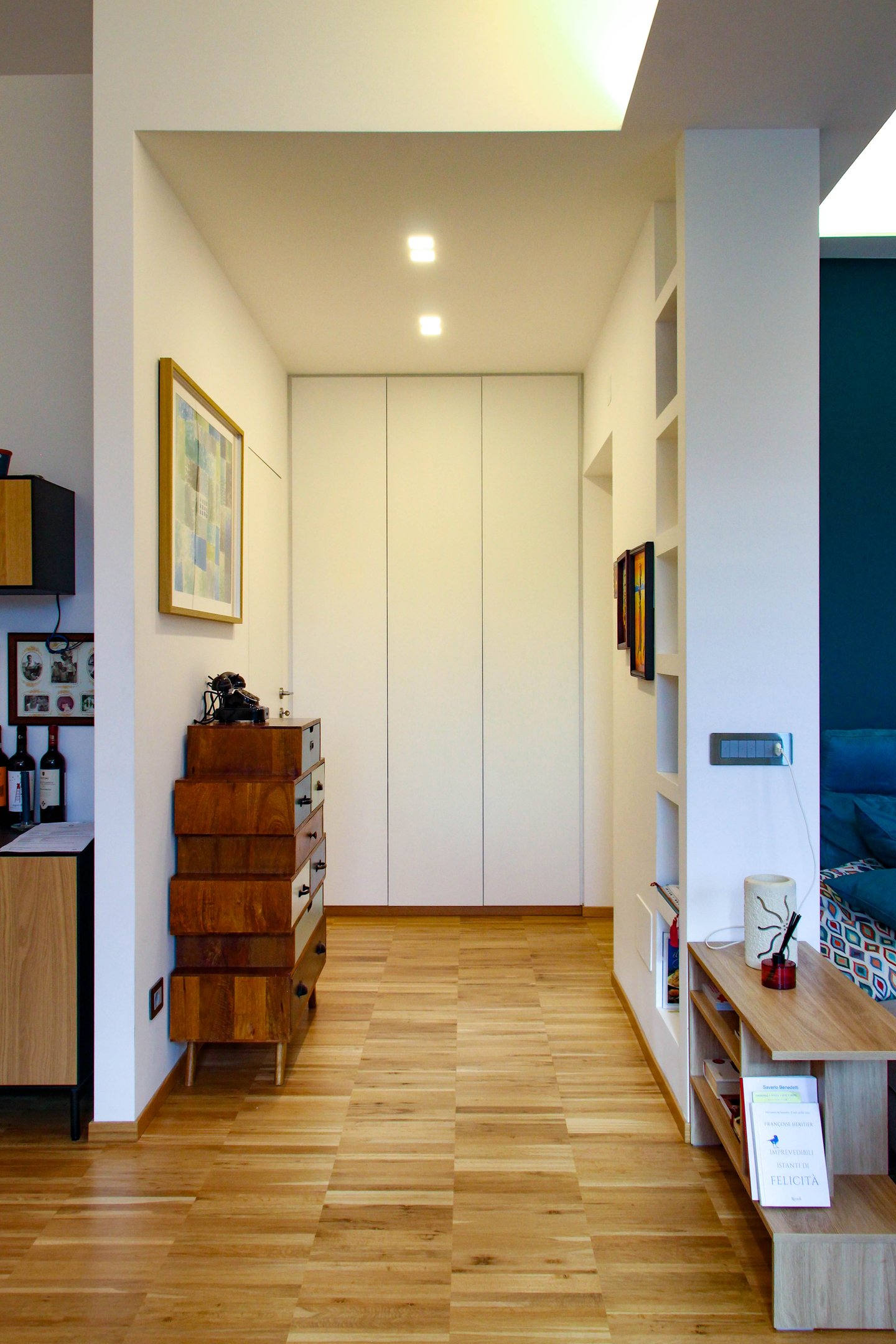 Il parquet, scelto come pavimentazione continua per tutta la casa, diventa l’elemento unificante del progetto: un filo materico che accompagna lo sguardo e dona calore, continuità e armonia agli spazi. La matericità del legno si ripete in modo coerente anche negli arredi su misura, nelle armadiature integrate e nella cucina, generando un linguaggio omogeneo. L’atmosfera che ne deriva è accogliente e raffinata, dove materiali naturali, proporzioni equilibrate e cura del dettaglio definiscono l’abitazione.