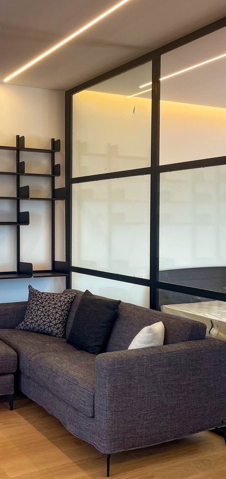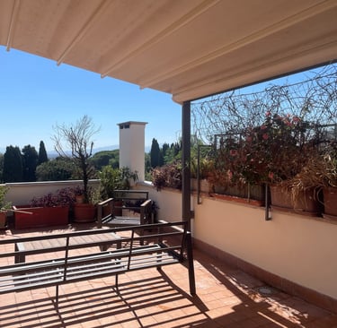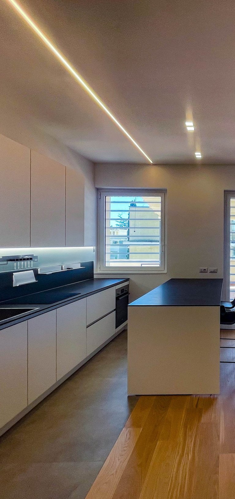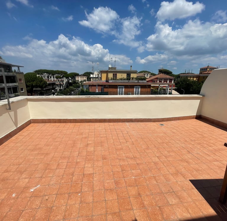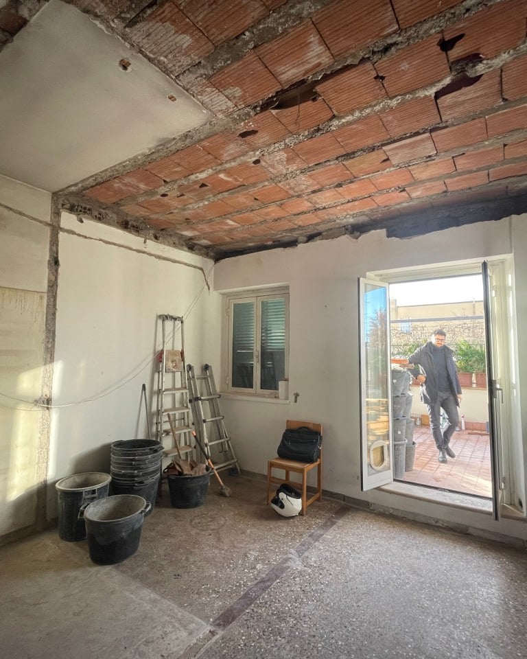 Particolare attenzione è stata dedicata al comfort termico: il solaio che separa l’abitazione dal terrazzo è stato completamente isolato, garantendo un’elevata efficienza energetica in ogni stagione. La zona notte, separata da quella giorno tramite un sistema di infissi su misura, mantiene un dialogo visivo e spaziale continuo — in perfetto stile loft — ma può all’occorrenza diventare uno spazio più raccolto e privato. L’accesso esclusivo al secondo terrazzo avviene solo dalla zona notte, trasformandola in una vera e propria suite con affaccio privato sul cielo di Roma, con affaccio su Villa Veschi.