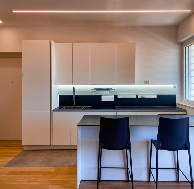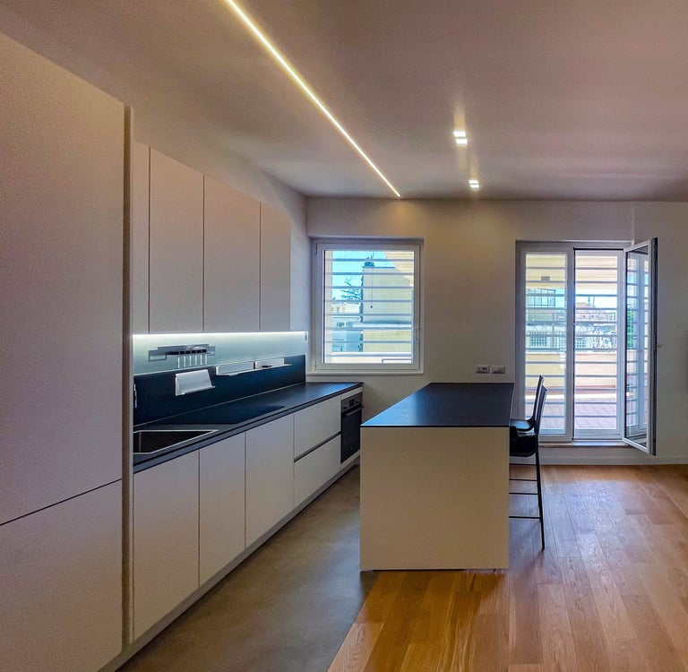 Nel cuore di Roma, un formale attico diventa un raffinato rifugio urbano per un nostro storico cliente tedesco. Il progetto nasce dal desiderio di generare un ambiente intimo ma aperto, dove la zona giorno si estende naturalmente verso il terrazzo principale, amplificando luce e prospettive.